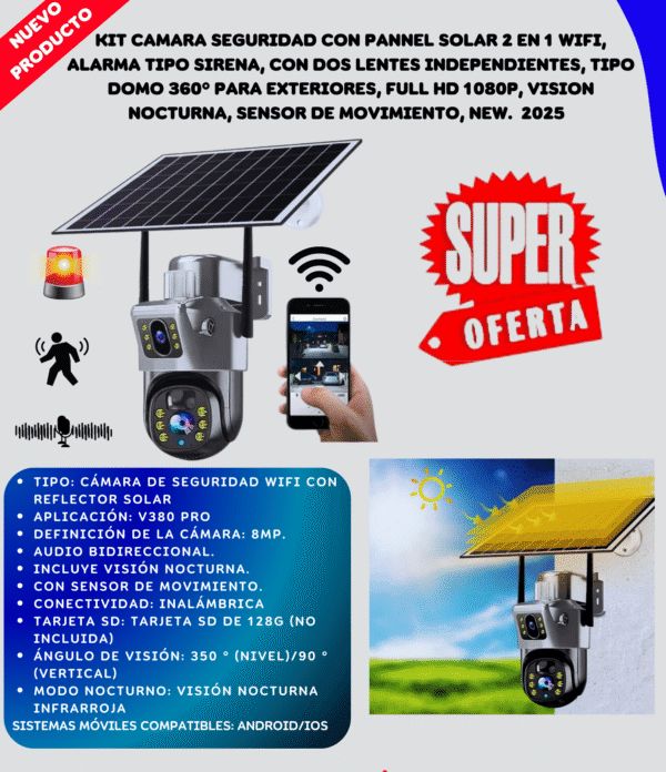 Asegura tus espacios con esta cámara de vigilancia exterior inalámbrica de doble lente, visión 360°, y funcionamiento por WiFi. Gracias a su panel solar incorporado, tendrás vigilancia constante sin depender de tomas eléctricas. Controla todo desde tu celular con la app V380 Pro. 📱🏡
